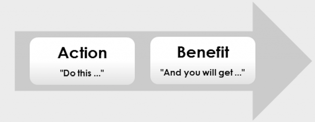 Framing an action within the benefits that are possible can address a need of your listener. Having a need fulfilled is emotional, and creating an emotional connection is a great way to motivate people to follow through on the suggested action. When you need to move a project along, close a sale, and just generally change a behavior the Action-Benefit statement is a powerful tool.